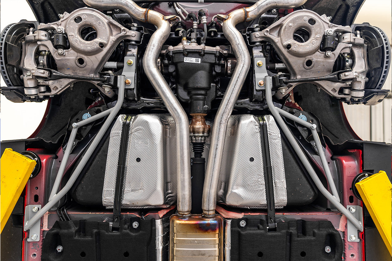 The 3rd and final piece to this kit is the strongest support brace for the S550/S650 IRS on the market!! Made in house from chrome moly steel, this brace is designed to support the factory subframe by directly tying it into the chassis at key mounting locations. Using factory mounting locations on the factory frame, this 5 point brace supports the front factory mount and the lower control arm mount as well. A simple bolt in design this brace ties the subframe to the chassis in the best possible way.